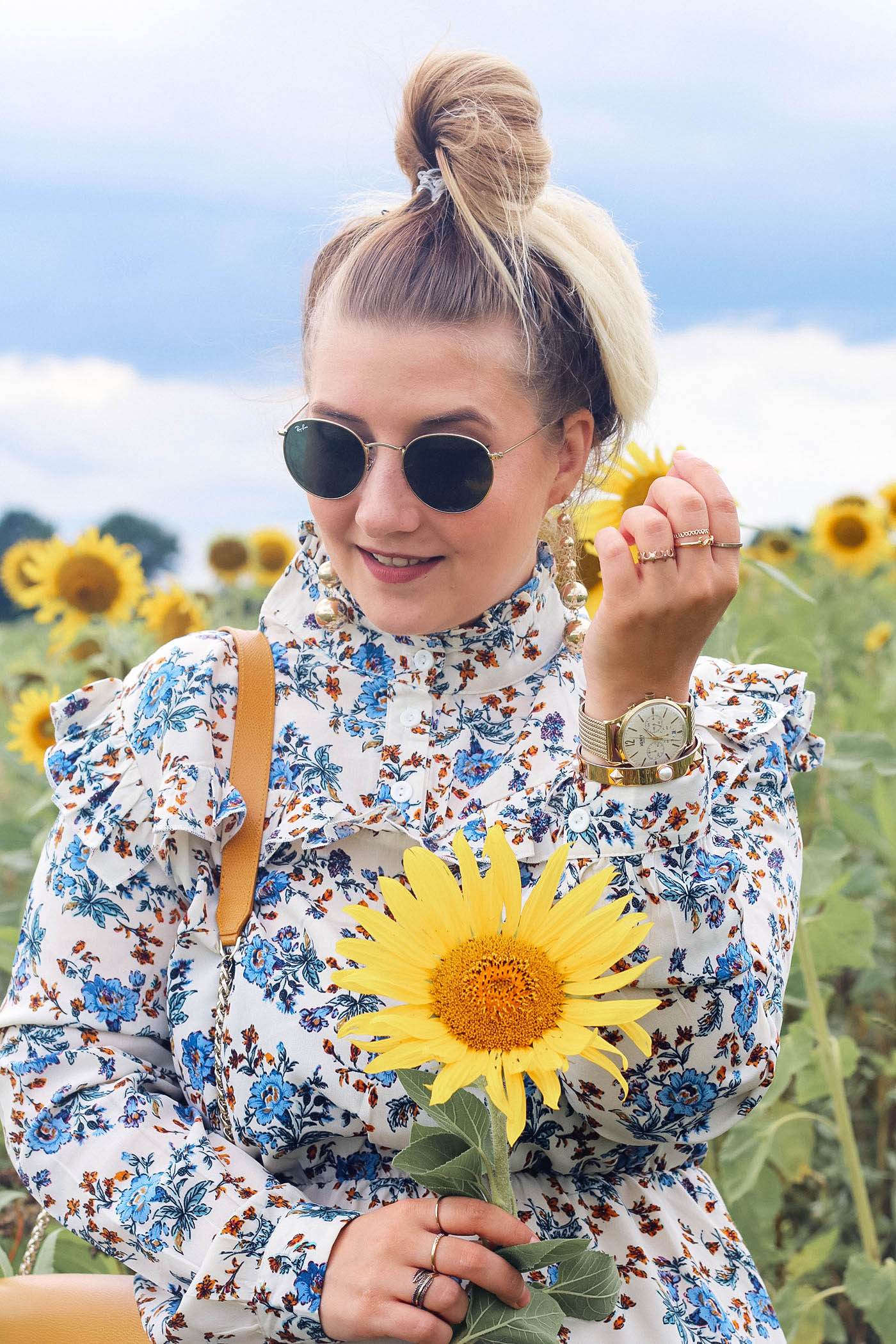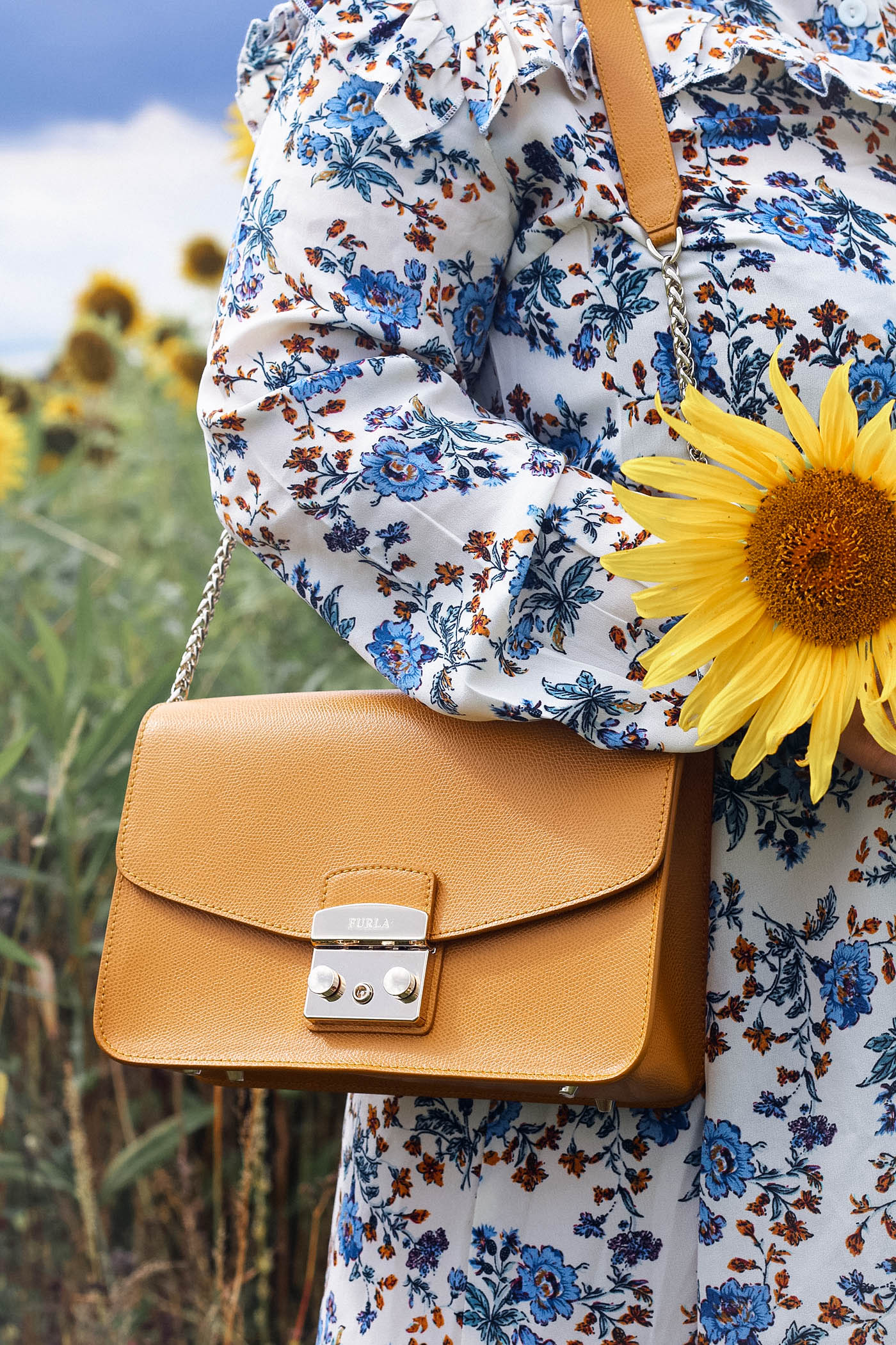 Der Schnitt ist für mich ehrlich gesagt eher ungewöhnlich, denn ich trage in der Regel lieber Offshoulder Kleider und keine hochgeschnittenen. Durch die süßen Volants am Kragen und genau diesen hochgeschlossenen Kragen, wird das Kleid aber umso mehr zum Hingucker und es gefällt mir richtig gut. Als Eyecatcher habe ich dazu meine neue Furla Metropolis Bag getragen, welche ich euch in diesem Post bereits vorgestellt hatte. Sie gibt dem ganzen Look nochmal einen Klecks Farbe und passt perfekt zu den blauen Blumen. Auch bei der Schuhwahl kann man bei diesem Kleid richtig kreativ sein. Meine liebe Bloggerkollegin Sandra von Black Palms hat zum Beispiel die grünen Samt-Adiletten kombiniert. Da ich aber den ganzen Tag unterwegs war und etwas Bequemes brauchte, habe ich mich für die Plateau Supergas Schuhe in schwarz entschieden. In weiß wären sie wahrscheinlich noch einen Tick besser gewesen, aber leider gehört bislang nur das schwarze Paar zu meiner Sammlung. Um den Look noch etwas mädchenhafter zu gestalter, habe ich auffällige goldene Ohrringe und eine Menge Armschmuck zum Kleid kombiniert. Insgesamt ist es also ein Alltagslook, welchen man gut zu jedem Anlass tragen kann. Wie gefällt euch das Kleid? Und wie gefällt euch die mal etwas außergewöhnlichere Kulisse mit den Sonnenblumen? [spacer]