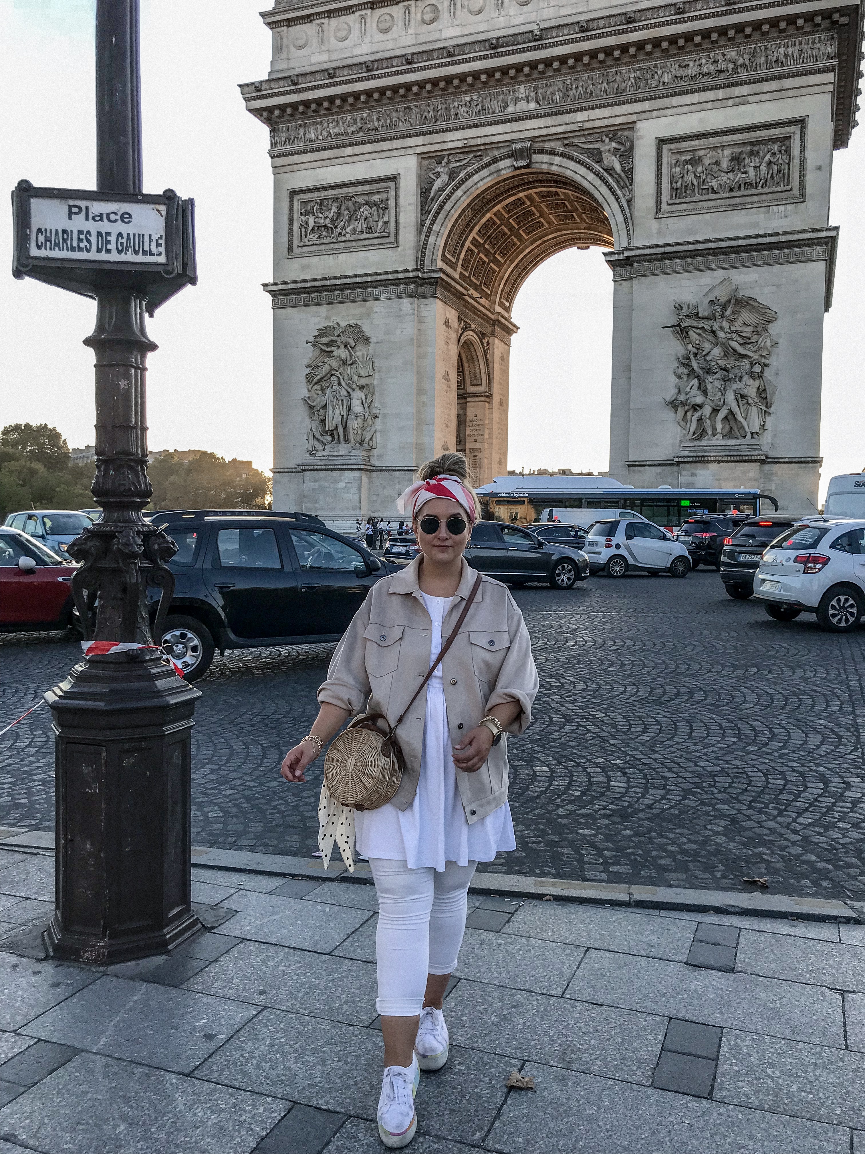 Natürlich kann man auch beim Triumphbogen super Bilder schießen, allerdings heißt es auch hier: Eine Menge Zeit einplanen! Der „Arc de Triomphe“ ist von Touristen übersät und der Verkehr dort ist wirklich ziemlich chaotisch. Viele Reisebussen, Taxen und vor allem Rollerfahrer jagen durch den Kreisel und so gut wie auf jedem Bild hat man entweder einen Menschen, der gerade ins Bild läuft oder neben einem Bilder schießt oder man hat eines der unzähligen Autos, Taxen oder Busse im Hintergrund. Man muss also auch hier den richtigen Moment abwarten. Wir haben spontan noch ein Bild geschossen, bei welchem ich einen Zebrastreifen ganz in der Nähe überquere und man den „Arc de Triomphe“ im Hintergrund sieht. Gefällt mir auf jeden Fall auch richtig gut.